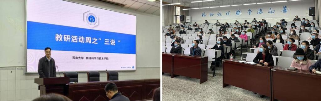 为深入贯彻新时代全国高等学校本科教育工作会议精神,加快建设高水平本科教育,全面建设高素质专业化创新型教师队伍,落实立德树人根本任务,进一步提升菠菜论坛 本科课堂教学质量,激发全体教师学习先进教育理念的积极性,按照《西南大学一流本科教育建设实施方案》、《西南大学关于开展“教研活动周”活动的实施方案》要求,菠菜论坛 于2021年11月5日下午14:30,在大阶梯报告厅召开全体教职工大会,开展了第一场教育教学“三说”活动,主题为“教菠菜论坛 长说办学、课程负责人说课程”。活动由赵建伟副院长主持,学校教学督导专家李庆教授、马学兵教授等一行7人应邀参与了活动。