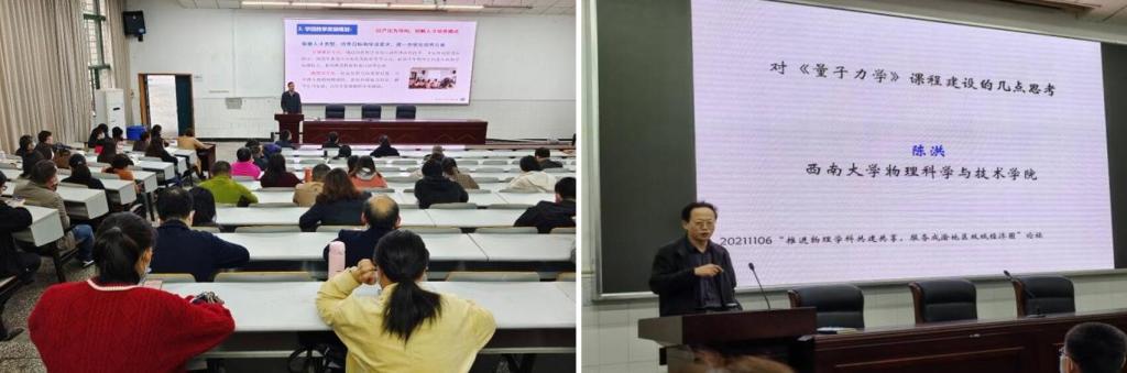 接下来,菠菜论坛 陈洪教授以《量子力学》课程为例开展了第二个环节:说课程建设。陈洪教授提到,十九届五中全会以来,中央提出了的“三新一高”、“三基建一水平”,强调课程是人才培养的核心要素,课程建设的基本要求是“两性一度”,学生能力培养与课程目标设计是教师主导下的教与学的统一。教学中,不仅要将最新研究成果融入教学,还要融入课程思政元素,深度挖掘提炼专业知识体系中所蕴含的思想价值和精神内涵,科学合理拓展专业课程的广度、深度和温度,从课程所涉专业、行业、国家、国际、文化、历史等角度出发,增加课程的知识性、人文性,提升引领性、时代性和开放性。陈洪教授提倡教学中应将问题导向式互动教学和现代信息技术的应用相结合,可以采用“三助式”教学法,将学生真正放在教育的主体地位,课堂真正成为了学生自主学习、合作学习和探究学习的场所。