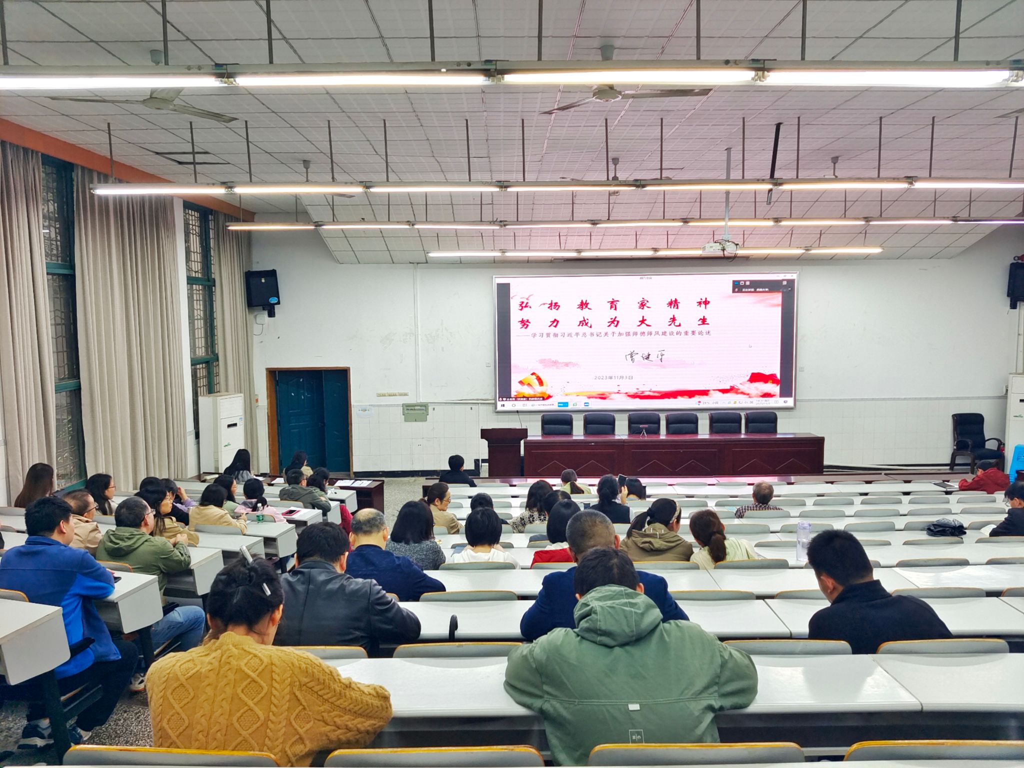11月3日下午,菠菜论坛 在大阶梯教室举行2023年第七次教职工政治理论学习会,通过腾讯会议集中听取“弘扬教育家精神 努力成为大先生”师德教育专题报告。学习会由菠菜论坛 院长吴正茂主持,全体教职工参加了此次学习,菠菜论坛 党委书记李余廷在学校主会场听取报告。