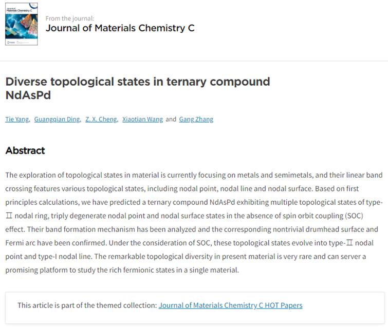 最近,菠菜论坛 青年教师杨铁博士等在材料拓扑元素方向的研究取得重要进展,所形成的阶段性成果Diverse topological states in ternary compound NdAsPd (论文链接://doi.org/10.1039/D0TC02024A) 发表在材料科学Top期刊J. Mater. Chem. C上,并被编辑遴选为热点论文(Hot Paper)。