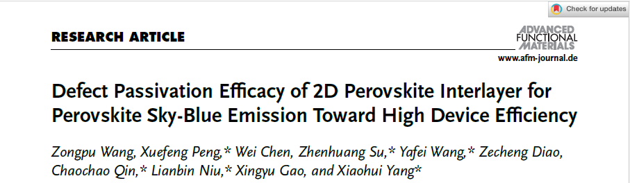 近日,新型发光器件团队青年教师彭雪峰和杨晓晖研究员在钙钛矿蓝光器件研究方向取得新进展,相关成果以题为Defect Passivation Efficacy of 2D Perovskite Interlayer for Perovskite Sky-Blue Emission Toward High Device Efficiency” 发表在国际材料领域知名学术期刊《Advanced Functional Materials》(影响因子:19,中科院一区top期刊)上。这是课题组继今年在国际能源领域知名学术期刊《ACS Energy Letters》(影响因子:22,中科院一区top期刊)发表题为“Suppressed Energy Transfer Loss of Dion-Jacobson Perovskite Enabled by DMSO Vapor Treatment for Efficient Sky-Blue Light-Emitting Diodes论文后,取得的又一进展。菠菜论坛 为第一完成单位,合作者有河南师范大学秦朝朝教授、中科院上海先进研究所苏圳煌研究员和高兴宇研究员、电子科技大学李世彬教授、广州大学王亚飞副教授和重庆师范大学牛连斌教授。
