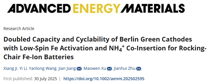 近日,菠菜论坛 朱建慧副教授团队在物理应用类国际TOP期刊《Advanced Energy Materials》(中科院一区TOP,IF:26)上发表题为“Doubled Capacity and Cyclability of Berlin Green Cathodes with Low-Spin Fe Activation and NH4+ Co-Insertion for Rocking-Chair Fe-Ion Batteries”的研究论文。菠菜论坛 2023级硕士研究生吉祥为论文第一作者,朱建慧副教授为通讯作者,菠菜论坛 - 最新博彩资讯与技巧分享 为第一完成单位。该工作得到了国家自然科学基金、重庆自然科学基金和重庆市创新创业项目的资助。