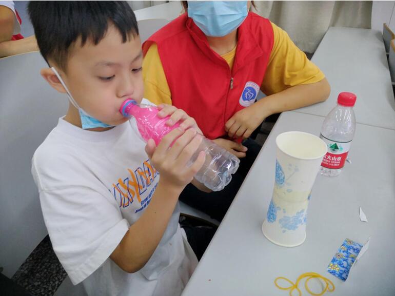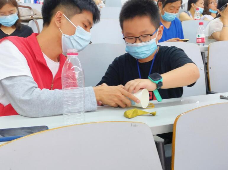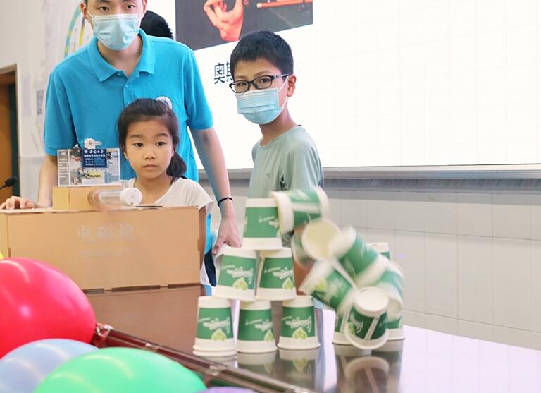 活动中讲解员苏日古嘎、李虹霖、方豪、王钰萱、黄欣琦、鄢然、李滢滢分别为小朋友们带来了“凭空传电”“电池取火”“电磁炮” “纸杯飞行器”“穿墙而过”“不瘪的气球”“纸杯挡水”“手摇发光棒”等有趣实验。