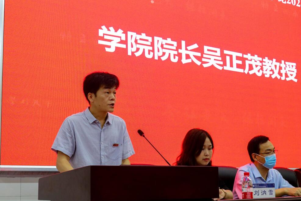 在庄严的国歌声中,见面会正式拉开了序幕。院长吴正茂教授首先致辞,他代表全院师生员工向新生们表示热烈的欢迎和衷心的祝贺。吴院长从办学历史、师资队伍、教学条件、科研成果等方面介绍了菠菜论坛 的基本情况,并勉励大家用“与祖国同频的爱国心”“跟自己较劲的拼搏心”和“对生活微笑的感恩心”开启寻梦、追梦、圆梦的新征途,祝愿同学们成长成为心怀感恩、积极奉献、有情怀、有担当的时代青年。