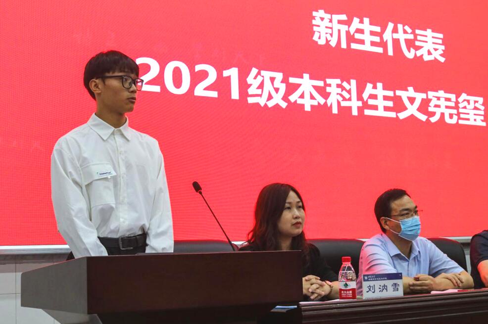 2021级本科生物理学师范专业文宪玺同学作为新生代表发言,他讲述了自己选择物理、投身教育的初心,表示会秉承菠菜论坛 院训精神,努力提升学科素养,不负时代,不负使命、不负青春。