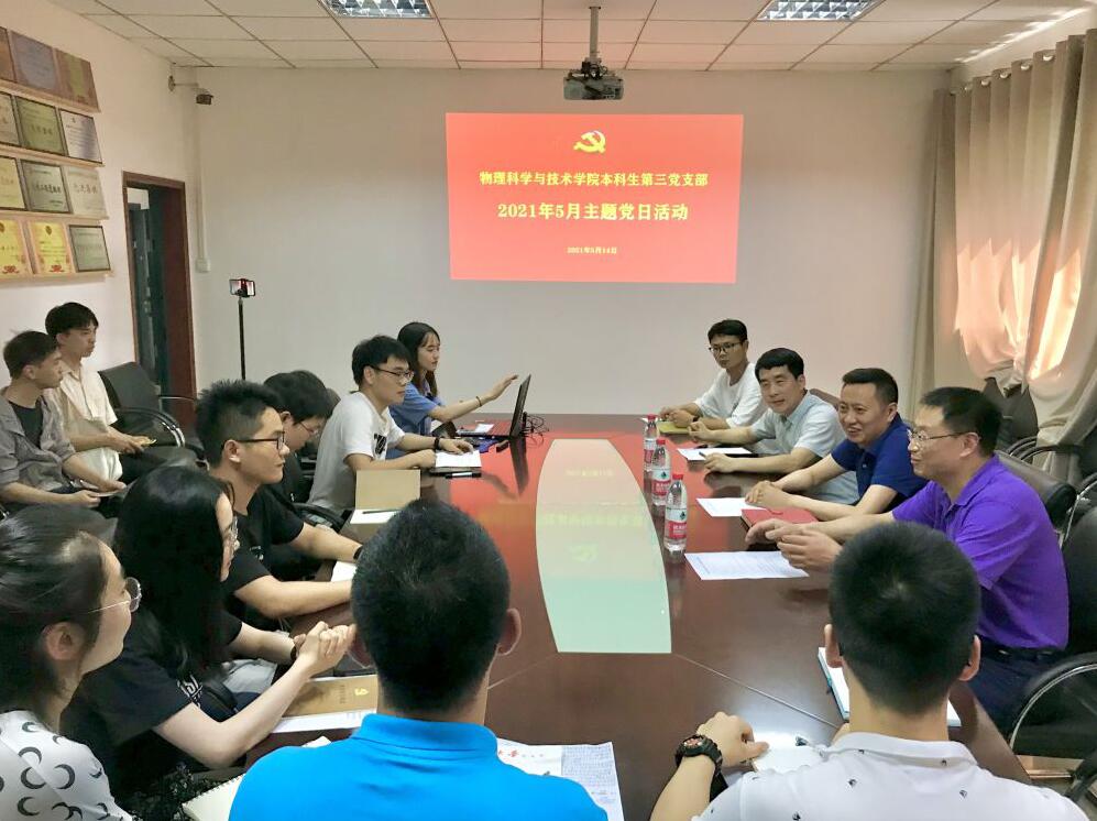 2021年5月14日下午,菠菜论坛 本科生第三党支部在二楼会议室举行“深学党史增强信念 细悟《条例》夯实基础”主题党日活动。学校党委保卫部副部长、保卫处副处长潘文峰,菠菜论坛 党委书记李余廷参加并指导本次活动。会议由党支部书记卜海东主持,全体党员参加。