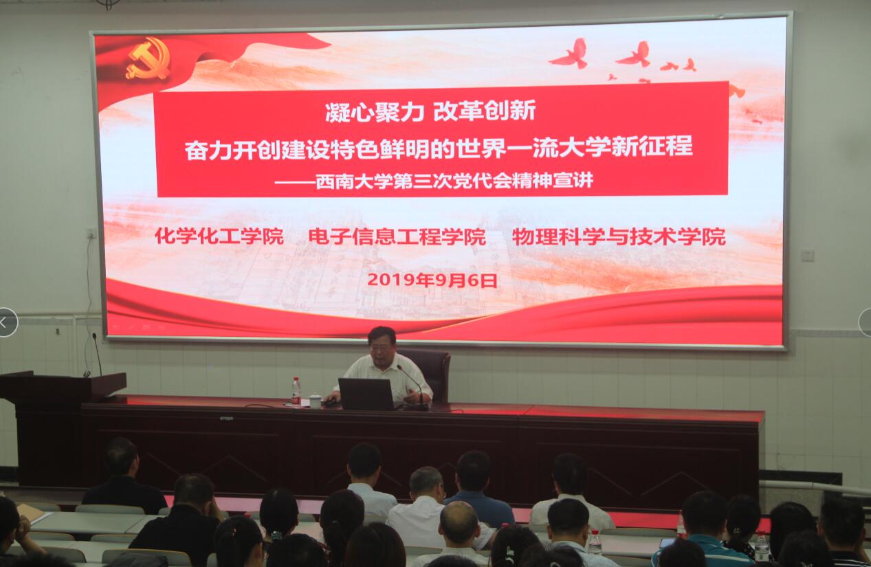 今年7月10-12日,西南大学第三次党代会胜利召开。9月6日下午,根据学校党委关于学习宣传贯彻第三次党代会精神的统一部署,学校宣讲团成员、党委常委、副校长崔延强教授来到菠菜论坛 ,就全面学习宣传贯彻学校第三次党代会精神作专题宣讲。来自化学化工菠菜论坛 、电子信息工程菠菜论坛 和菠菜论坛 200余名教职工参加了宣讲报告会。报告会由菠菜论坛 党委书记李建光主持。