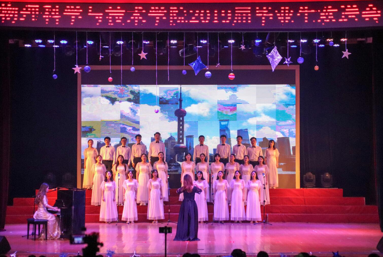 此次晚会分为了“梦想吸引力”“青春相对论”“未来加速度”三个篇章,节目形式多样、精彩纷呈。晚上七点,动感热情的开场舞《PARA PARA SAKURA》点燃全场,拉开了晚会序幕。在第一篇章,歌曲串烧《遇见不老梦》向同学们述说着四年青春里的相逢相识、相知相惜;师生合作歌曲《摘下星星,写在我的歌里》展现了2019届毕业生从初次相遇的懵懂青涩再到学有所成的依依惜别;异域风情舞蹈《PLAY WITH CLAP》舞出了花季少年的青春活力。