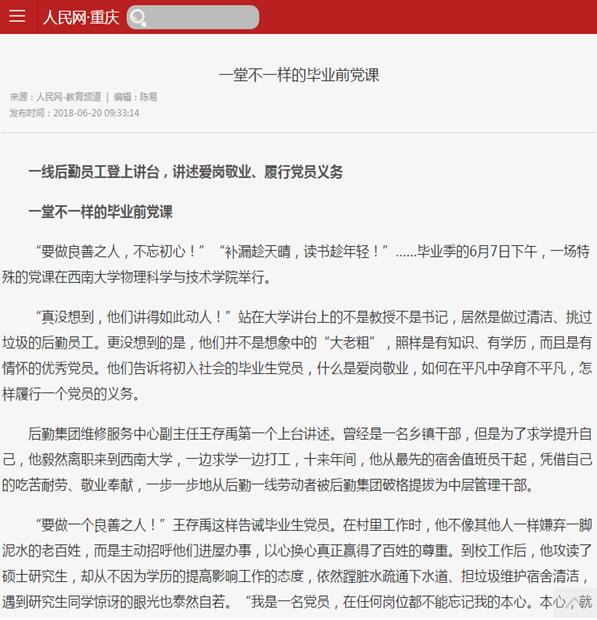 菠菜论坛 党委创新毕业生党员培训的形式,获得师生一致好评,其中组织2018届全体毕业生党员和部分低年级党支部代表举行的题为“学习习近平新思想、做新时代党员”的特殊党课,引起多家媒体关注,社会反响良好。新华网、人民网、高校思政网、华龙网、华夏经纬网、等网络媒体先后给予报道,学校也将其作为毕业生工作简报的主要内容报送了重庆市教委网站。值得注意的是,《中国教育报》在6月19日头版,《重庆日报》6月25日头版均进行了单篇报道刊载。