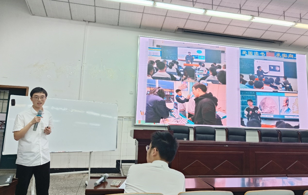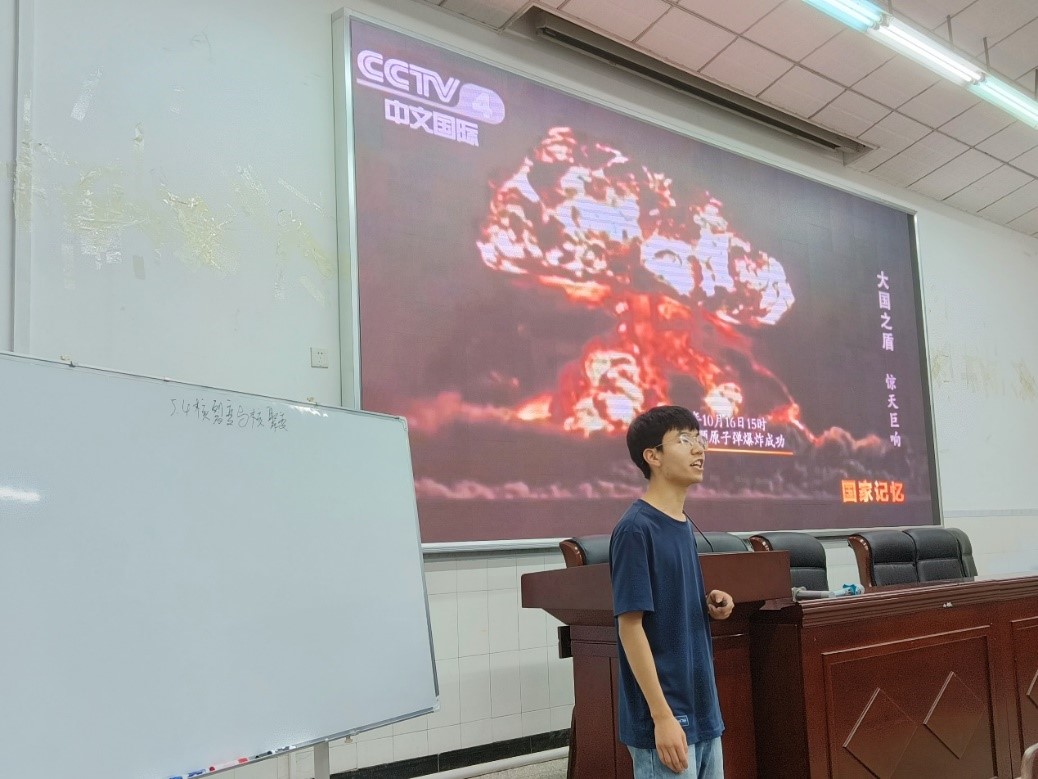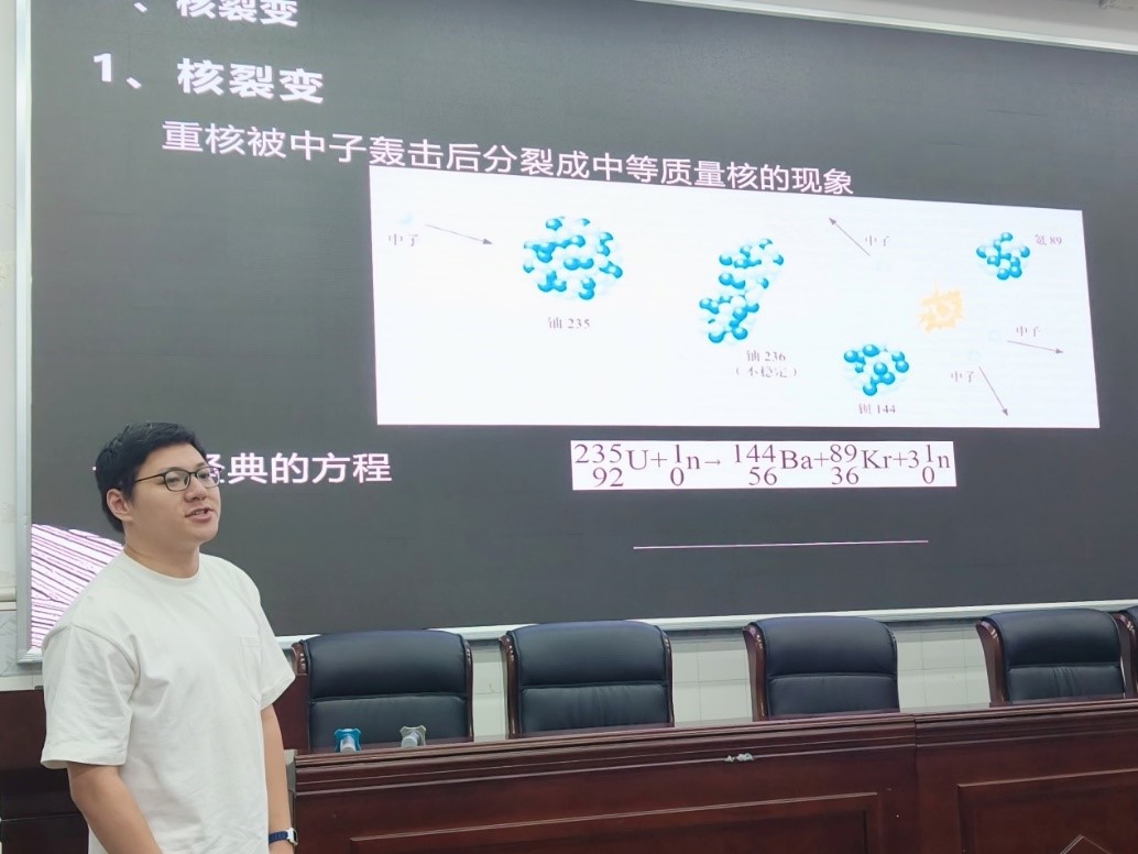 来自师范一班,在西南大学附属中学实习的吴天富同学用“大国之盾——原子弹”作引入,为大家讲解核裂变的同时更激发着同学们的爱国情怀。