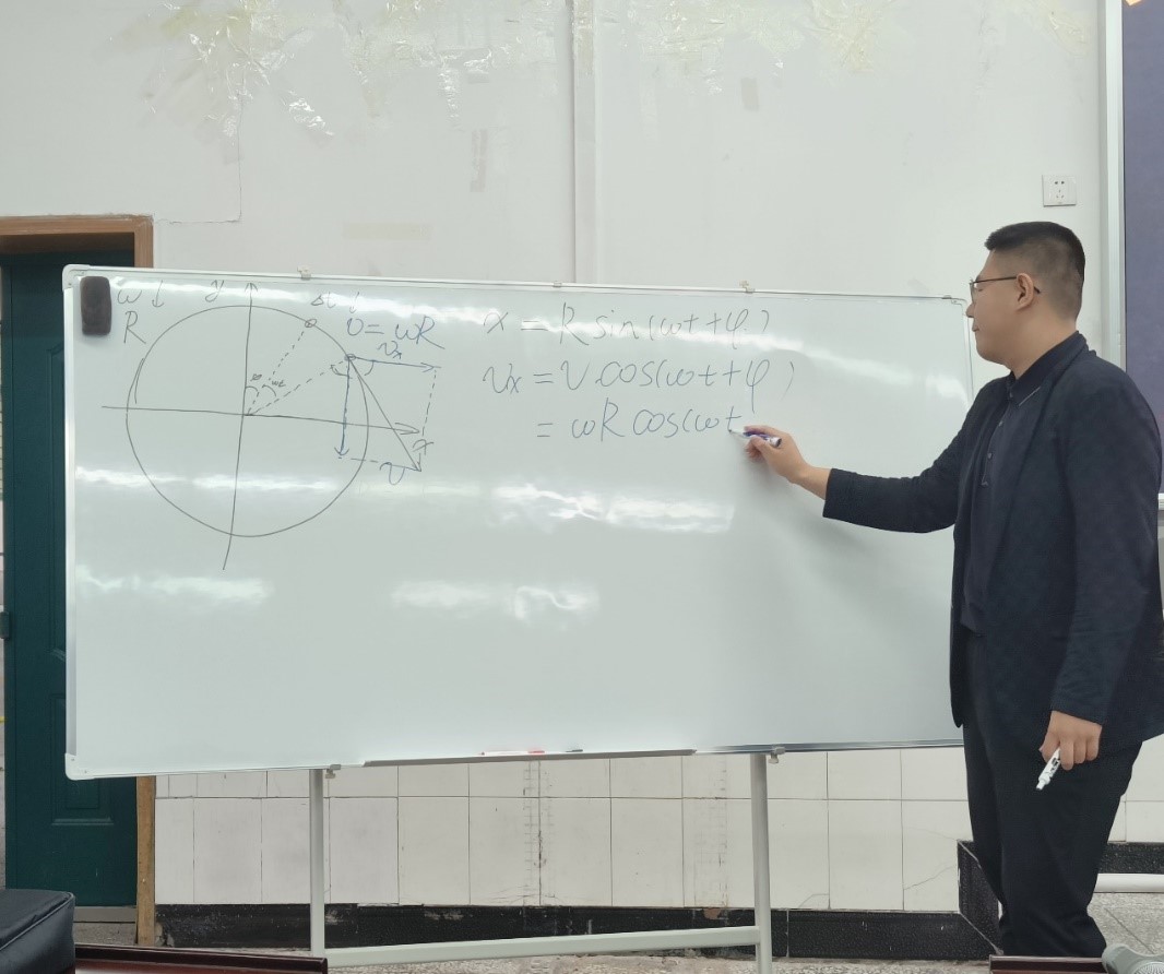 来自师范一班,在山西省榆次第一中学校实习的王云韬同学,靠着自身洪亮的声音和过硬的专业素质,用板书推导出简谐运动中的圆周规律,其极具张力的课堂风格让大家感觉仿佛是在听一名老教师上课。