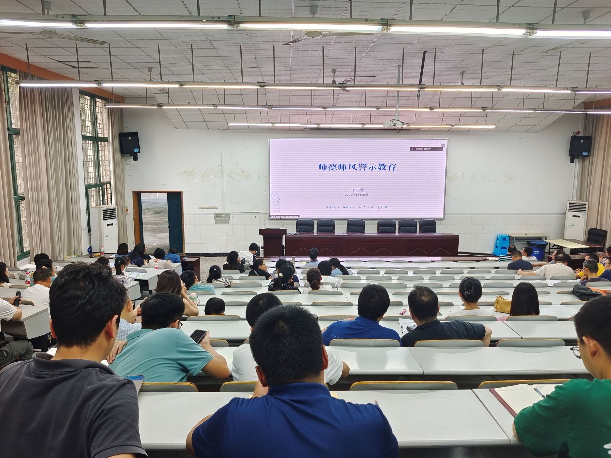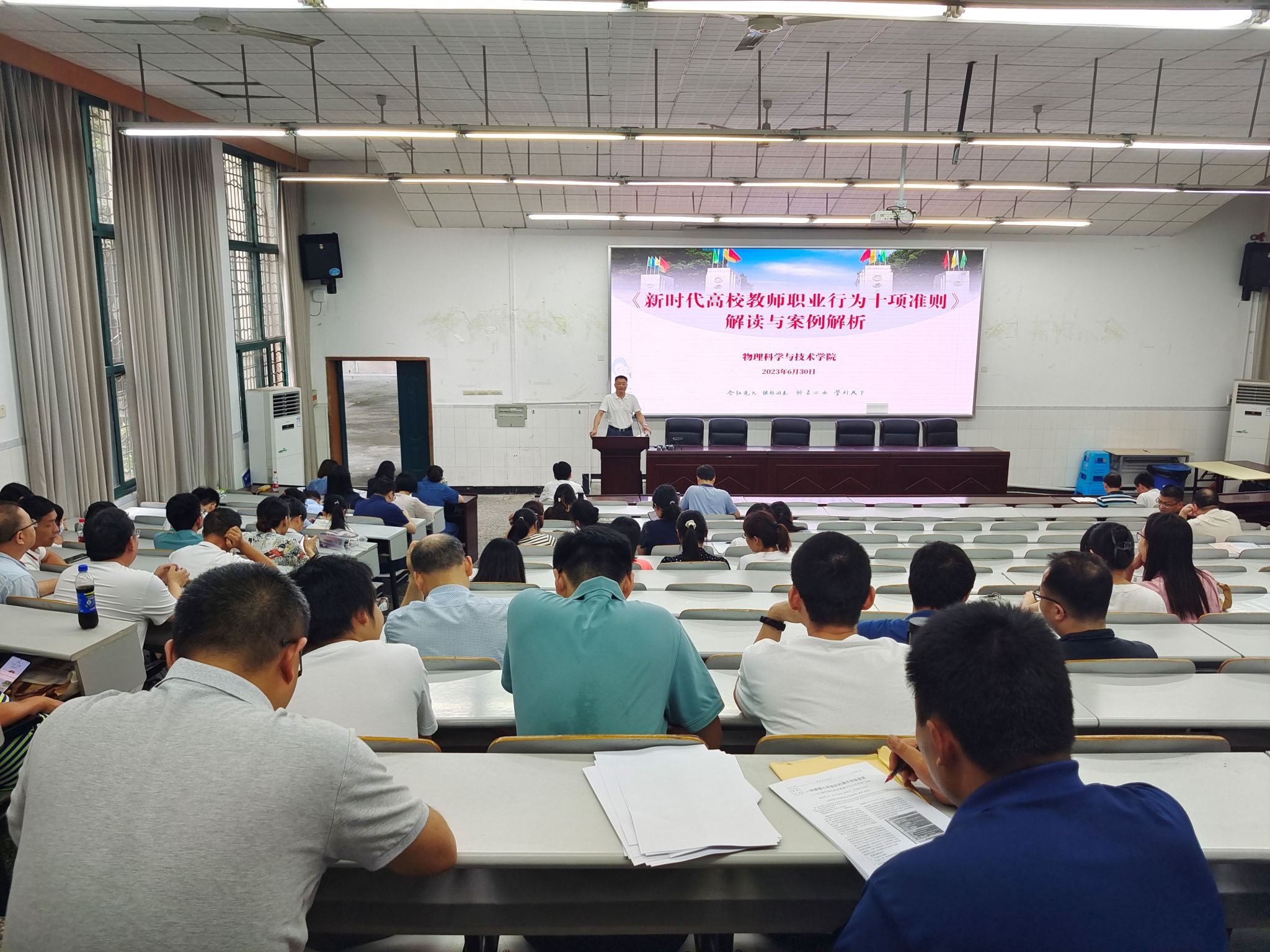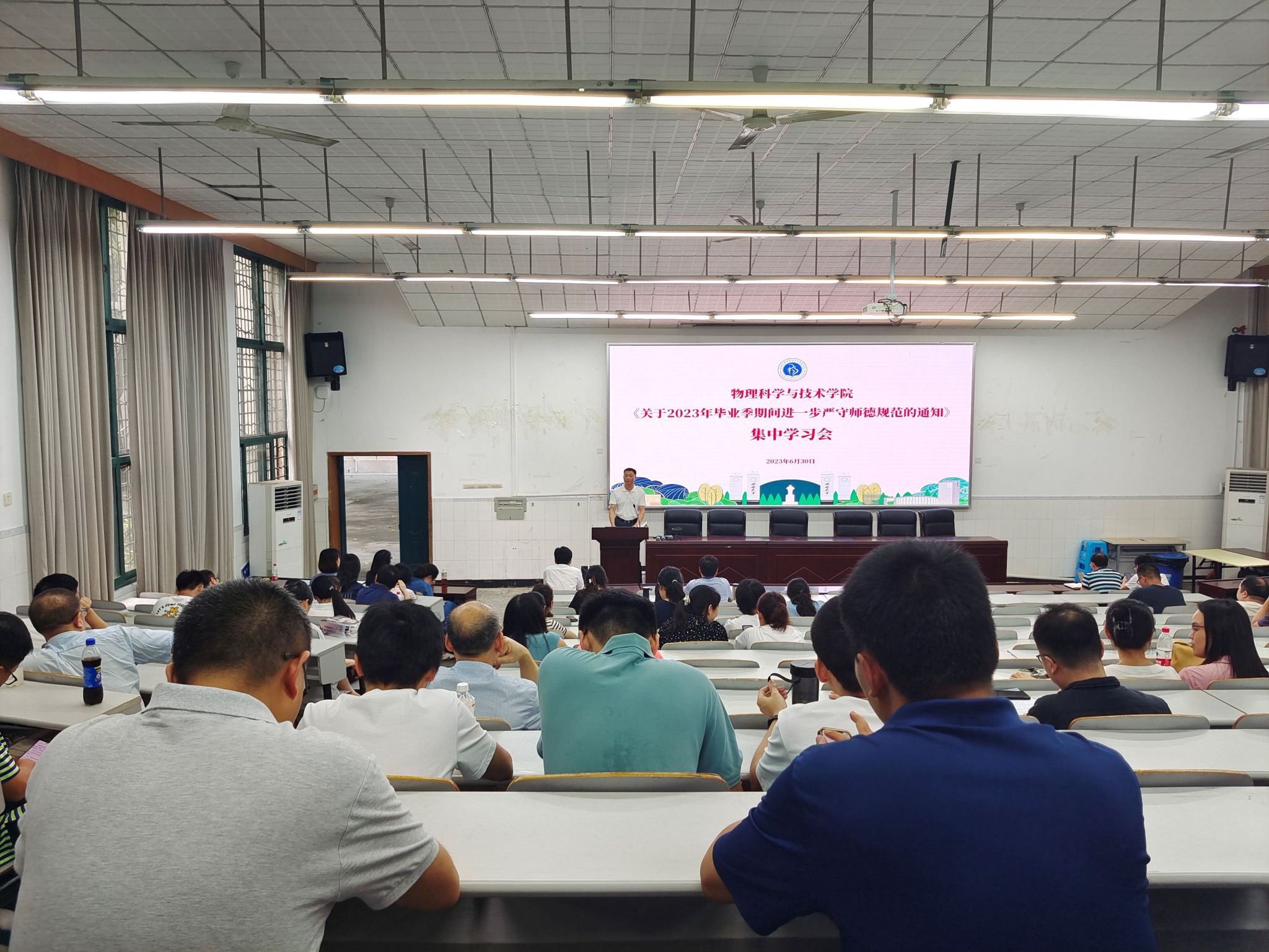为深入学习贯彻习近平新时代中国特色社会主义思想,贯通学习习近平总书记关于教育的重要论述和指示批示精神,落实教育部和学校关于开展师德集中学习教育的工作要求和部署,6月30日下午,菠菜论坛 在大阶梯教室组织开展师德集中学习教育专题学习会,全院教职工参加学习。菠菜论坛 党委书记李余廷主持学习会。