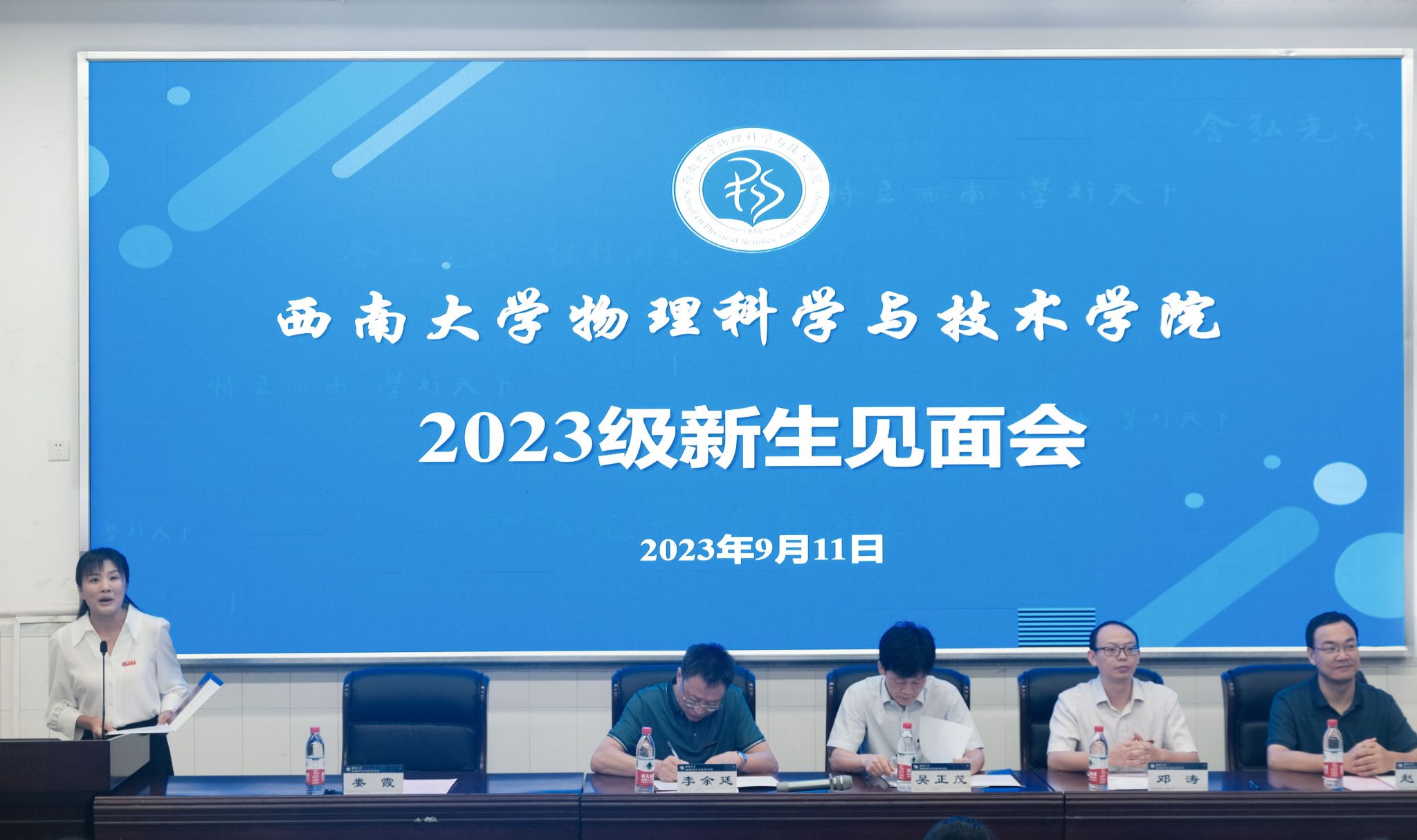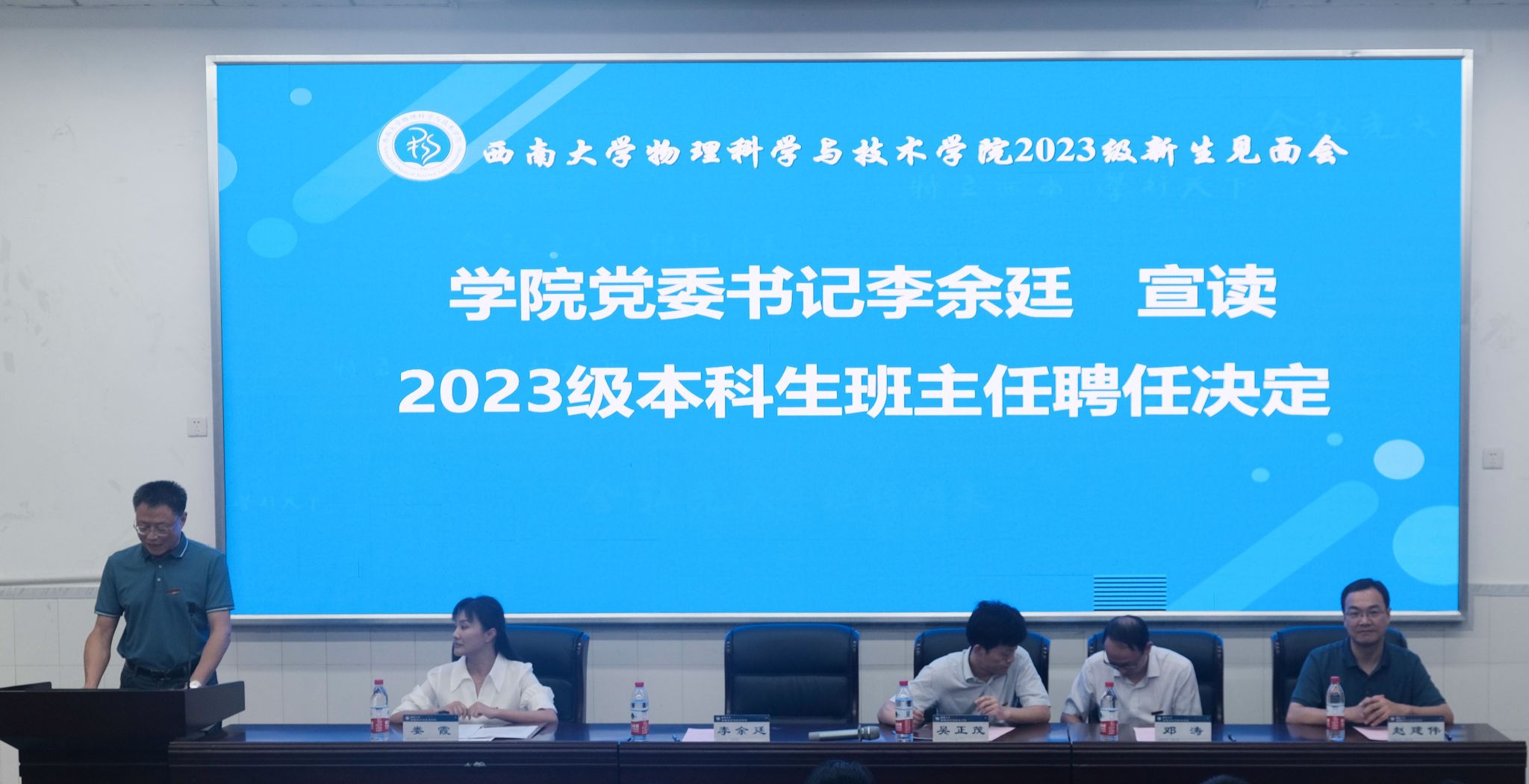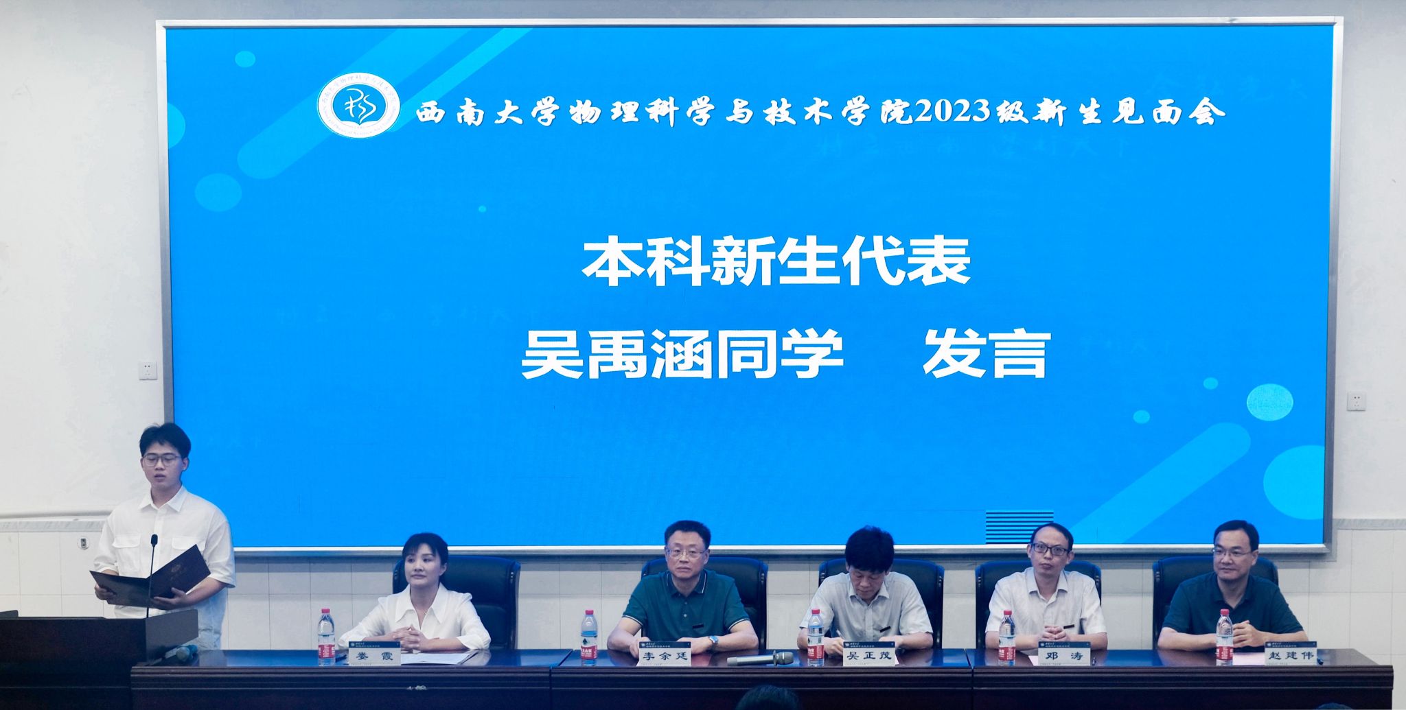 新生班主任朱华星老师作为教师代表发言。他分享了自己在西大物院的求学并留校任教的经历,他说:“来到物院不仅能学习专业知识,还能感受到家庭的温暖和关怀”。同时他也鼓励同学们能细心、用心、耐心、从容地体味大学生活,乘风破浪,勇往直前。