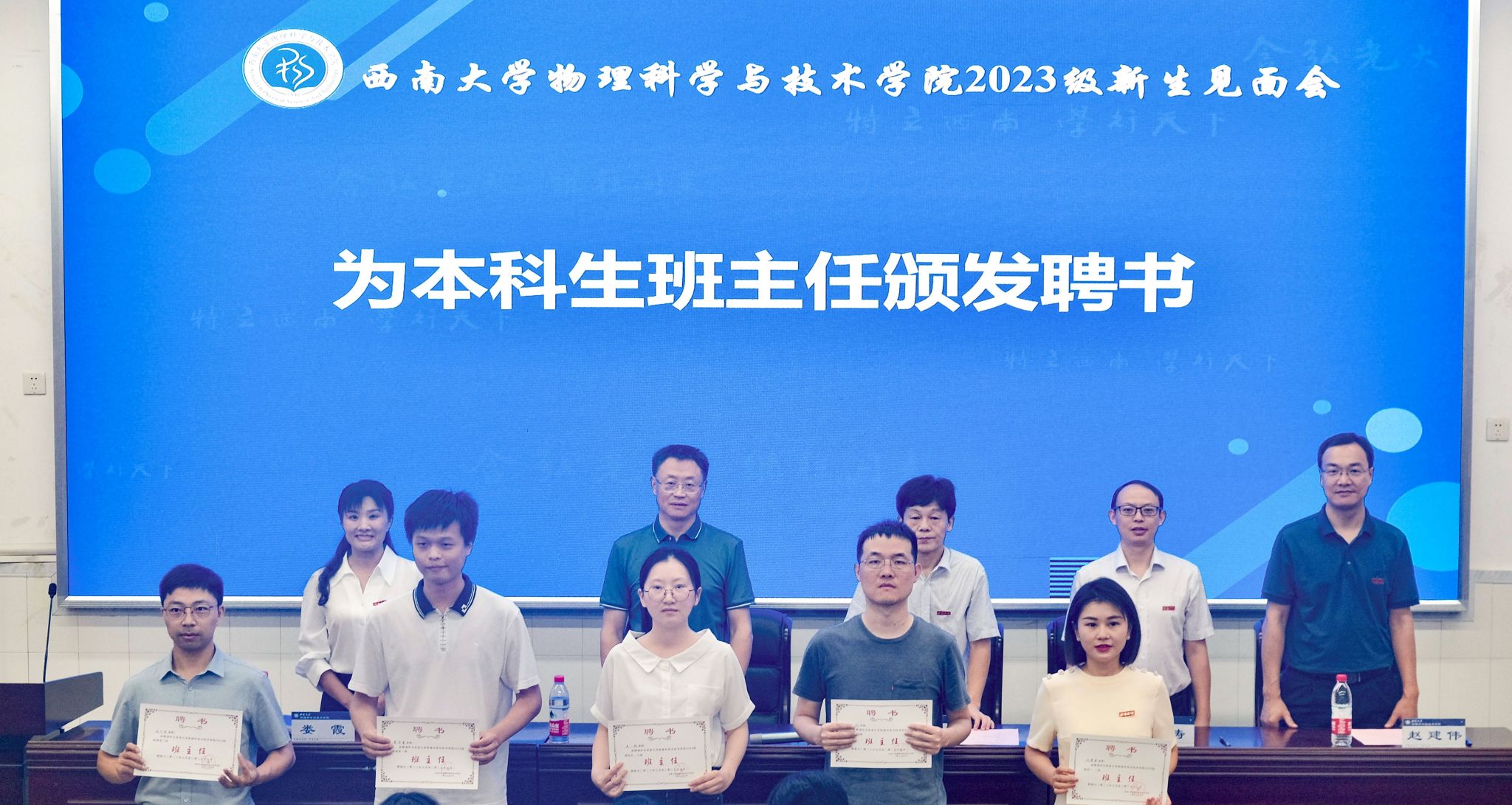 菠菜论坛 党委书记李余廷宣读2023级本科生班主任聘任决定,为师范1-2班班主任刘津津、师范3-4班班主任时珂、师范5-6班班主任王韬、物理学1班班主任朱华星、物理学2班班主任石文武颁发了聘书,同时殷切嘱托各位班主任老师为学生做好教育服务管理工作,关注学生急难愁盼,努力为学生解决问题,带领班集体成为一个个团结奋进、朝气蓬勃、温暖和谐的大家庭。