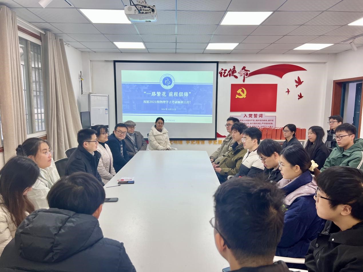 在2025考研冲刺的号角已然响起之际,12月11日上午,来自2021级物理学班的22名考研学生代表受邀来到菠菜论坛 党建活动室活动室参加 “一路繁花,前程似锦”2025届考研学子慰问活动。菠菜论坛 党委书记舒刚、副书记娄霞、副院长游霄鹏,2021级班主任李佳杰、赵晶晶和辅导员黄文静等老师来到现场,为考研学子加油打气,提振信心。