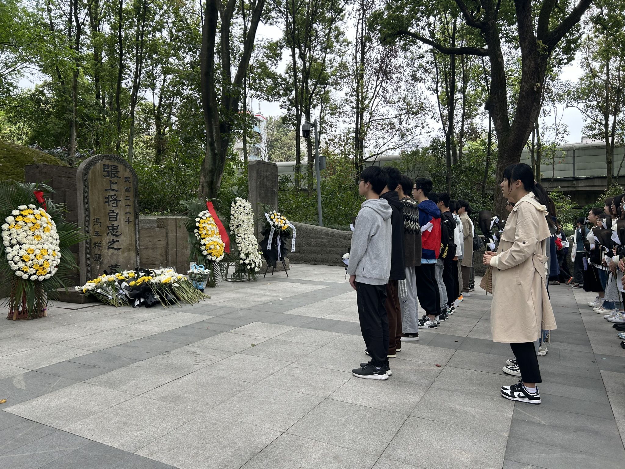 同学们来到张自忠将军纪念雕像前,肃立列队,脱帽默哀,深切悼念这位民族英雄抵御日寇、为民族解放所作出的贡献。随后,大家还围绕张自忠将军墓,敬献白花,瞻仰英雄墓碑,缅怀先烈,表达崇敬之情。