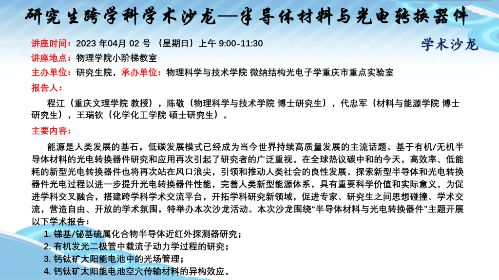 【学术沙龙】研究生跨学科学术沙龙—半导体材料与光电转换器件