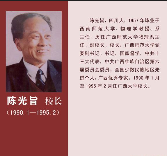 陈光旨,男,1934年生,重庆市荣昌县人,1957年毕业于西南师范菠菜论坛 物理学系,同年到广西师范大学任教。历任助教、讲师、副教授、教授,系主任、副校长、校长、党委书记;中共十三大代表、中共广西区第六届委员会委员、政协广西第七届委员会委员、教文体委员会副主任;中国物理学会理事,广西物理学会常务副理事长、理事长,广西教育学会副会长,广西高等教育学会副会长,广西老教授协会常务副会长,国家督学等职。出版专著和译著8部,200多万字;在国内外多种刊物发表物理学、管理学和教育学论文120余篇。曾获全国高校优秀教材二等奖、广西科技进步二等奖,广西优秀教学成果二等奖、广西社会科学进步三等奖、广西教委科技进步一等奖、中南地区高校优秀图书三等奖。先后获“全国少数民族地区先进科技工作者”、“全国优秀教育工作者”、“广西优秀专家”等称号,享受国务院特殊津贴。