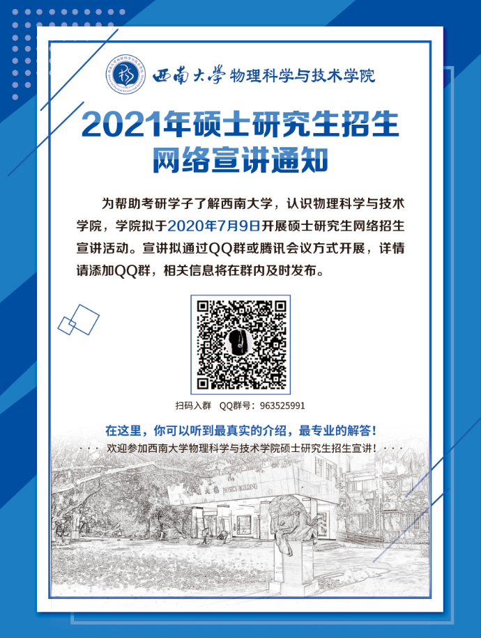 为帮助考研学子了解西南大学,认识菠菜论坛 ,菠菜论坛 拟于2020年7月9日开展硕士研究生网络招生宣讲活动。宣讲拟通过QQ群或腾讯会议方式开展,详情请添加QQ群,相关信息将在群内及时发布。 QQ群:963525991 在这里,你可以听到最真实的介绍,最专业的解答!