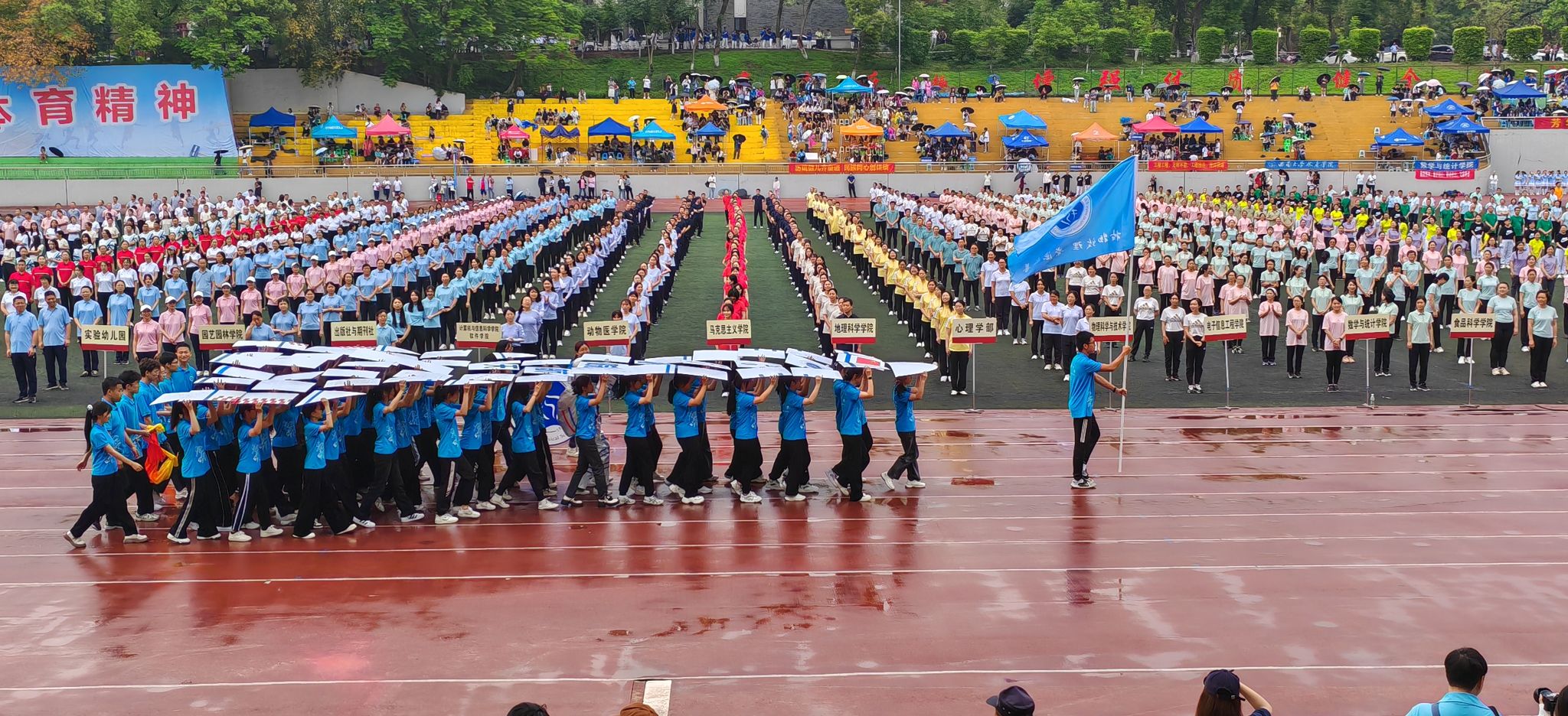 此次校运会,菠菜论坛 共计有40名学生参加了12个单人项目、1个团体项目的比赛,30名教师参加了5个单人项目、8个团体项目的比赛。运动健儿们在跑道上奋力拼搏全力向前,在田径赛场上聚精会神奋力一跃,在团体项目中齐心协力共创佳绩。大家热情高涨、充满激情,菠菜论坛 工会、各年级辅导员和近百名学生参与了志愿服务和后勤保障工作。虽春雨绵绵,赛场上仍有未干的雨迹,但大家发扬着拼搏和坚持的体育精神,顺利完成了各项比赛。