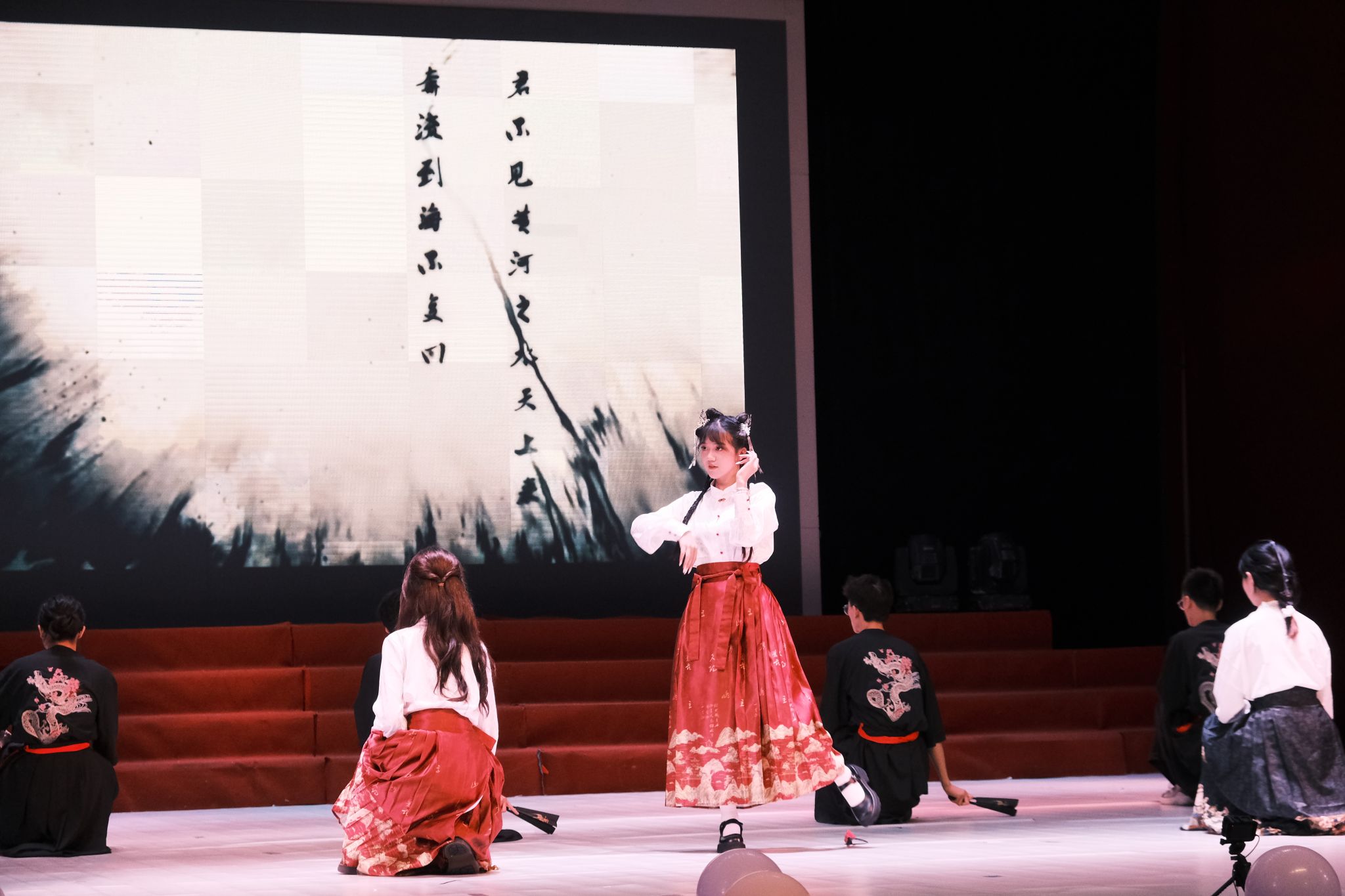 本场晚会由“青春·热烈的诗行”“青春·奋楫的手函”“青春·未来的序章”三个篇章组成,菠菜论坛 师生联袂带来16个精彩纷呈的节目。晚上7点,团委学生会办公室带来的国风舞蹈《将进酒》拉开了演出的序幕。