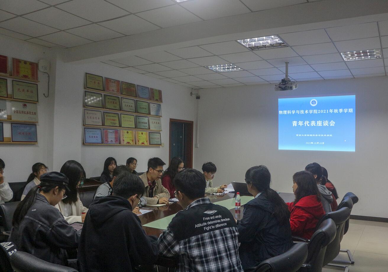 为进一步调研菠菜论坛 青年学生的发展需求,有针对性的开展思想政治教育工作, 10月20日下午,菠菜论坛 在物理大楼二楼会议室召开2021年秋季学期青年学生代表座谈会。菠菜论坛 党委副书记刘汭雪、团委书记贺颖、2020级辅导员晏勇出席,团委学生会、科普社、党员先锋队的学生骨干,校第六次学代会菠菜论坛 参会代表以及低年级学生代表共计30人参会。